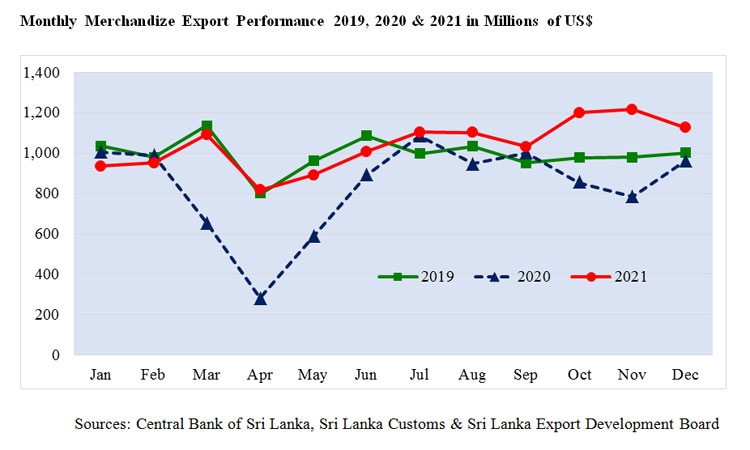 Sri Lanka’s merchandise exports increased by 16.71% to US$ 1,125.69 Million in December 2021 compared to December 2020 as per the data released by the Sri Lanka Customs. In parallel, 12.48% increase recorded in December 2021 compared to December 2019.