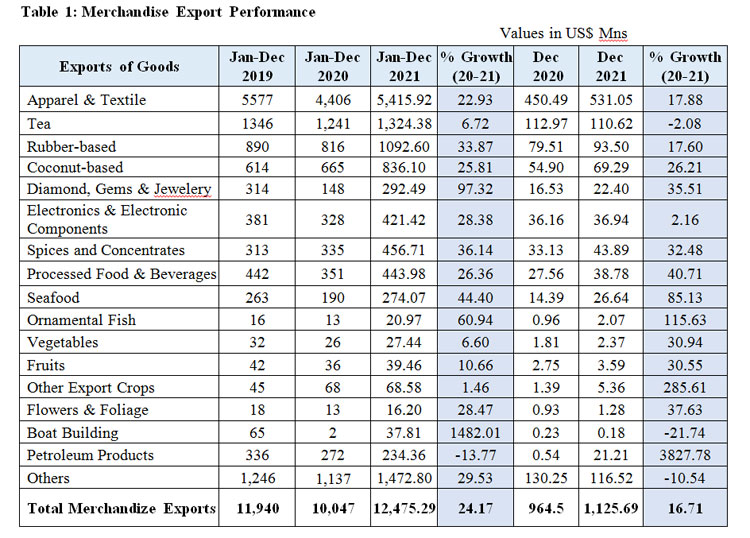 For the period of January to December 2021, merchandise exports increased by 24.17 % to US$ 12,475.29 Million compared to the corresponding period of 2020. Almost all the major product sectors; Apparel & Textiles, Tea, Rubber-based products, Coconut based products, Electronics & Electronic Components, Spices and Concentrates, Food & Beverages, Seafood and Ornamental fish as shown in the table below, recorded increased exports.