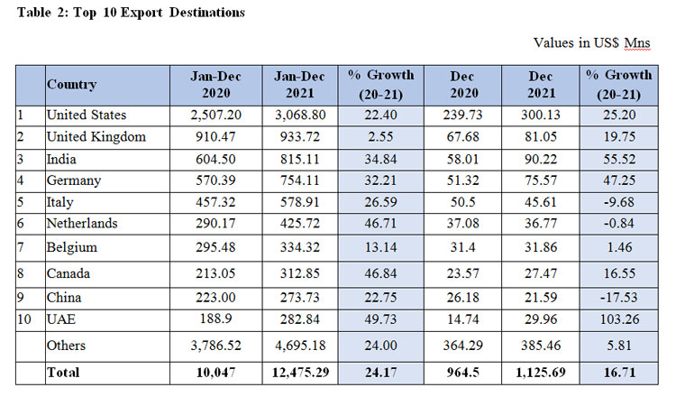 During the period of January to December 2021, exports to Free Trade Agreement (FTA) partners accounted for 7.2% of total merchandise exports increased by 33.57 % to US$ 906.99 Mn.