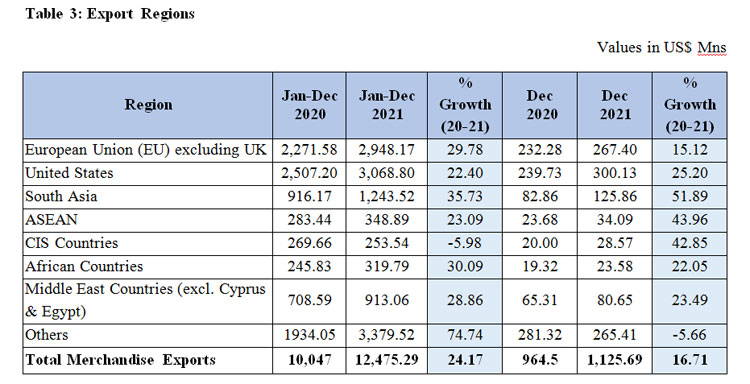 On a region wise comparison exports to all other regions increased except CIS regions during the period of January to December 2021 compared with the corresponding period of the previous year.