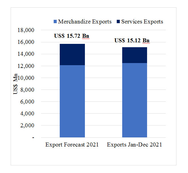 The revised export forecast of the Export Development Board for 2021 is US$ 15.72 billion and of that we expect US$ 12.14 billion from merchandise exports and US$ 3.58 billion from services exports. During the period January to December 2021, earnings from exports recorded US$ 15.12 billion including the estimated services data for October to December and 96.2 % achieved from the revised export target.