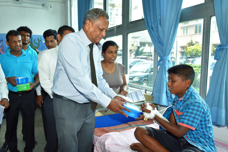 SLIC Chairman Mr.Hemaka Amarasuriya hand over the gift to a child who is getting treatments at the hospital