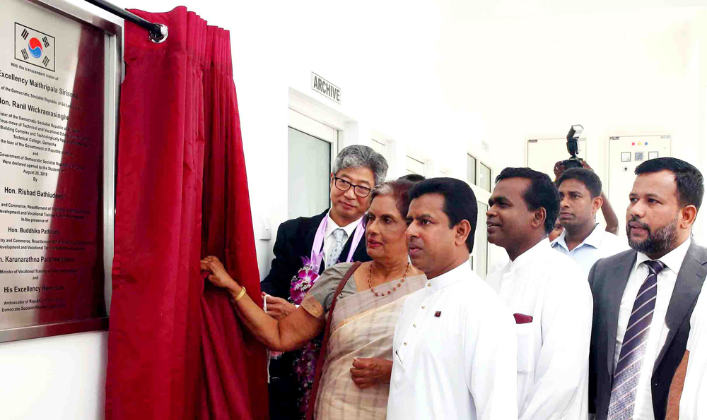 “Today I met PM Ranil Wickremesinghe and we discussed how to create more modern TVET training centres in Sri Lanka. We decided to set up nine more new centres similar to recently launched Korea-Sri Lanka National Vocational Training Institute in Orgodawatte with South Koren funding. We thank the people of South Korea for this valuable support” said the Minister of Industry, Commerce, Resettlement of Protracted Displaced Persons, Cooperative Development, Skills Development & Vocational Training (ICTPDPCDSDVT) Rishad Bathiudeen on 28 August in Gampaha. Joined by his State Minister Buddhika Pathirana, former President Chandrika Bandaranike Kumaratunge, Minister of Skills Development and Vocational Training Karunatilleke Paranavithana, Minister of Transport Arjuna Ranatunga, HE South Korean Ambassador in Sri Lanka Heon Lee, and the Country Director of Colombo Representative Office of Korea Eximbank Daekyoo Park, Minister Bathiudeen was addressing the launch event of modernised Gampaha Technical College (GTC) in Gampaha. The GTC, launched exactly 20 years ago, has been modernised by a US $4.5 Mn South Korean loan funding which is part of the second phase of the two stage US $26 Mn project (the first stage was the Korea-Sri Lanka National Vocational Training Institute launched on 21 August in Orugodawatte). “We are also planning to set up a fully-fledged Ocean University at a cost of US $ 50 Mn. We will be able start work on it in the coming weeks. The Ocean University we have at present is not a fully fledged institution“ said Minister Bathiudeen and added: “A Sri Lankan industry study last year showed that 400000 new jobs will be available in Sri Lanka in the next three years in hotel, tourism and industry sectors. According to a study by the University of Colombo 58% of unfilled vacancies in Sri Lanka are in apparel sector 20% in food industry and 33% in other manufacturing sectors. Therefore the Skills Development and vocational training institutions under my Ministry we are working to address this situation.”