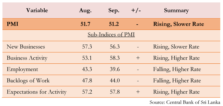 Services PMI recorded an index value of 51.2 in September 2022 indicating a marginal expansion in the services sector driven by the increases observed in New Businesses, Business Activities and Expectations for Activity.