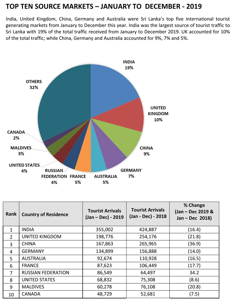 India, United Kingdom, China, Germany, and Australia were Sri Lanka’s top five international tourist generating markets in 2019.