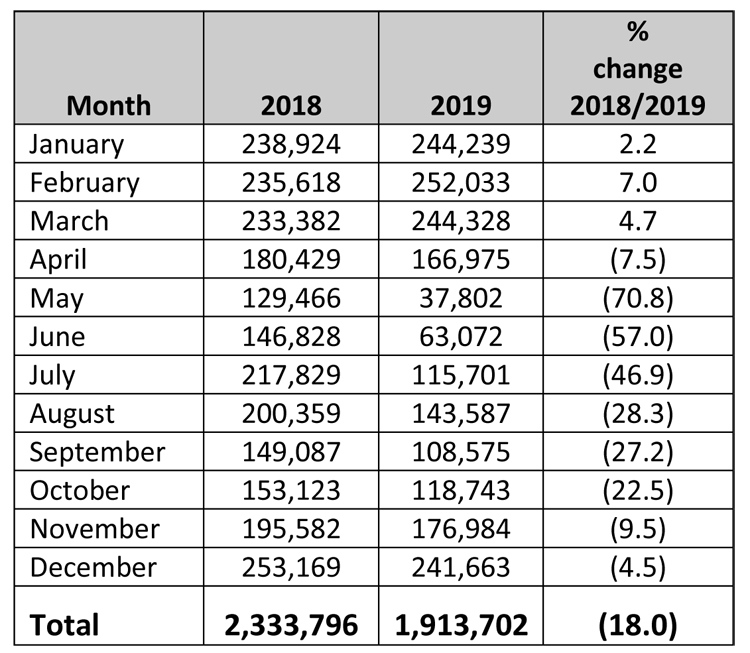 Sri Lanka received 1.9 million tourists last year, with December recording the highest number of arrivals with 241,663 tourists since the Easter bombings in April the latest data released by the Sri Lanka Tourism Development Authority (SLTDA) showed.