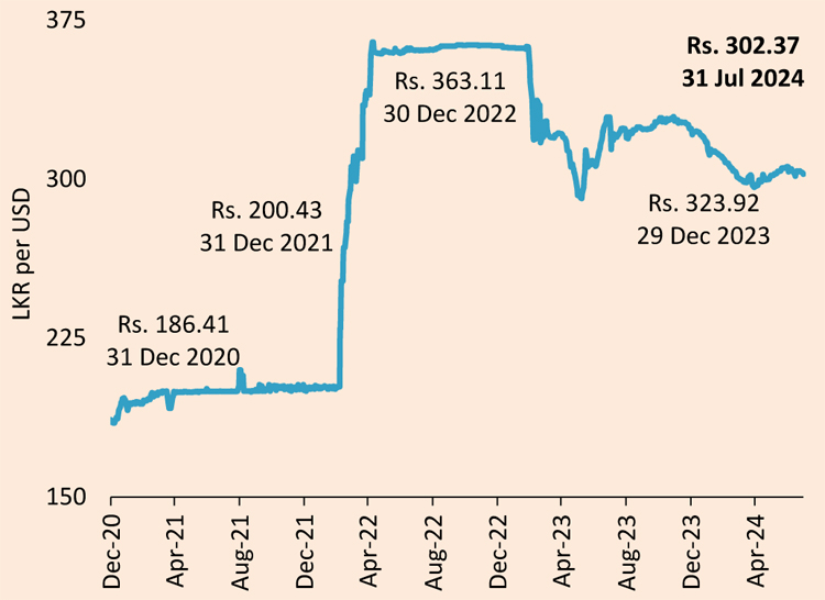 The Sri Lanka rupee appreciated by 7.1 per cent against the US dollar during the year up to 31 July 2024. Meanwhile, reflecting cross-currency movements, the Sri Lanka rupee appreciated against other major currencies, such as the euro, the pound sterling, the Chinese yuan, the Japanese yen, the Indian rupee, and the Australian dollar during the year up to 31 July 2024.