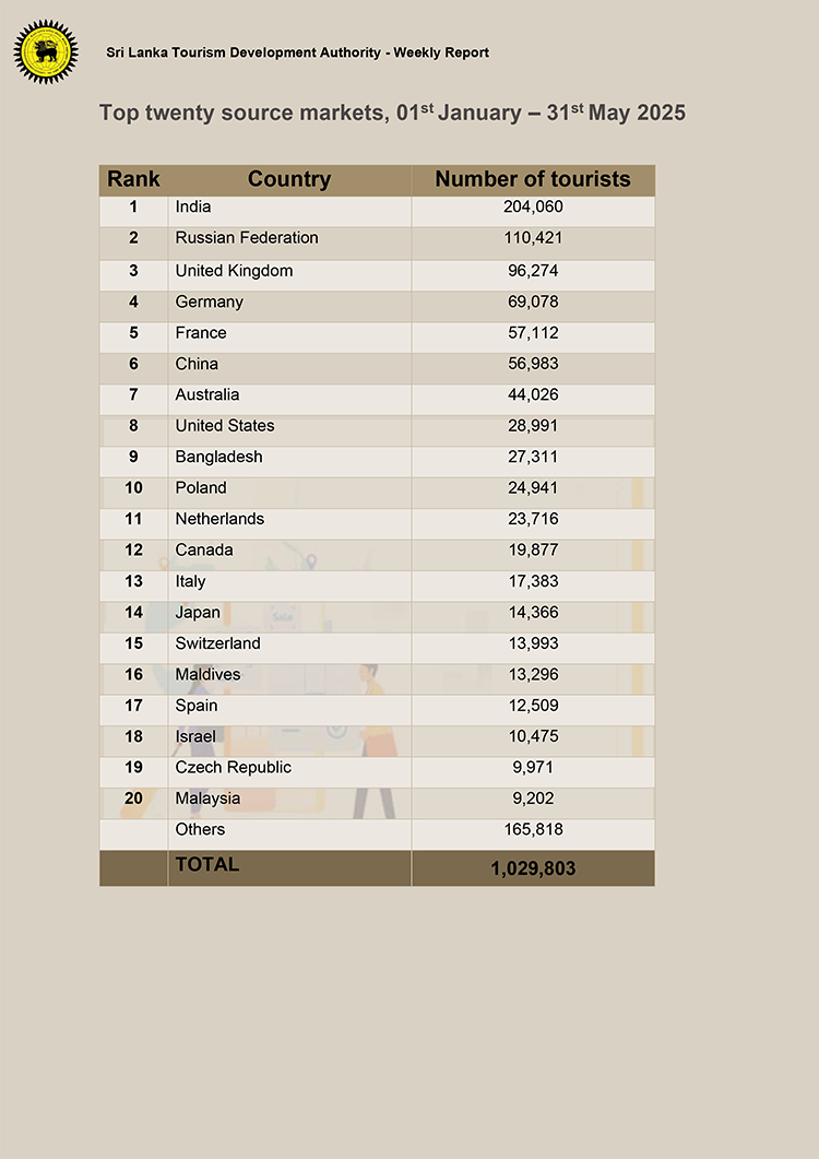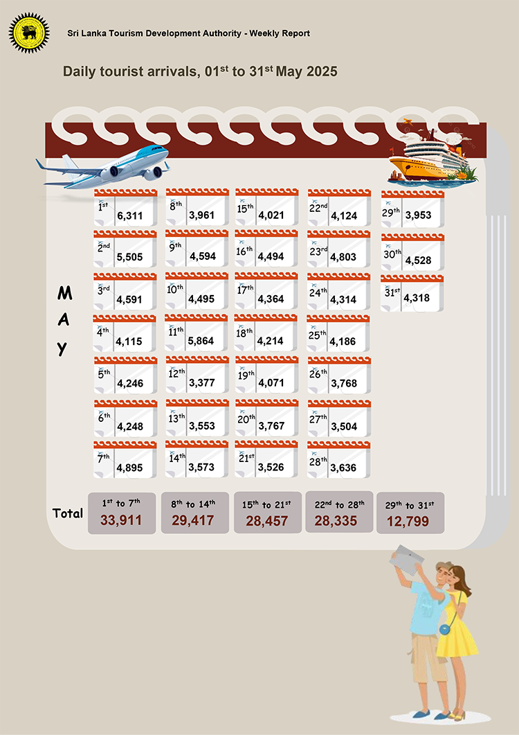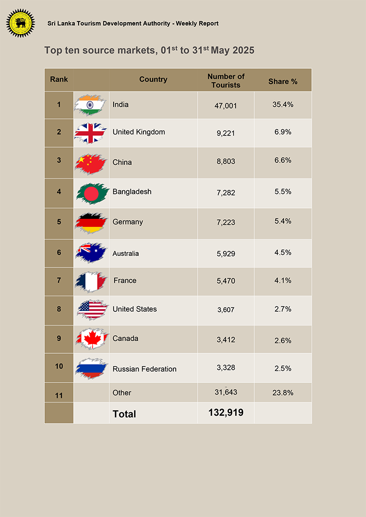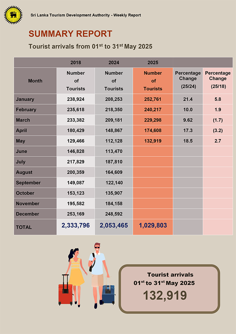 A total of 132,919 tourists have arrived in the country in May 2025, data from the Sri Lanka Tourism Development Authority (SLTDA) shows.
