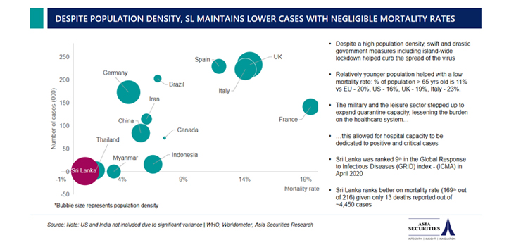 Sri Lanka’s mortality rate which is ranked 169 out of 216 countries, places it among the global top in terms of pandemic preparedness. The low mortality rates are attributed to strong management of the pandemic by the government, effective containment and quarantine strategy, efficient use of hospital capacity, and the relatively young population in (only 11% of Sri Lanka’s population are above the age of 65, compared to developed markets like the US and EU which are 16% and 20%, respectively).