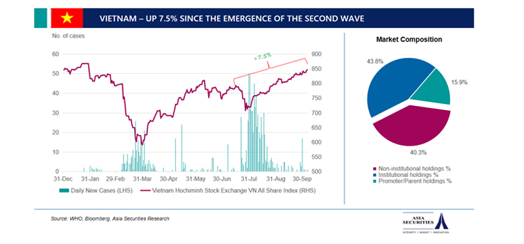 In Vietnam, for example, the main index on the Ho Chi Minh Stock Exchange is up 8% from the point before the second wave was detected in July, the report highlights. Similarly, in Malaysia, the main stock market index has bounced back to pre-second wave levels in early September. Similar trends have been observed in many developed markets. In Australia, where the second wave has come and gone, the stock markets index is up 2%. Even in Italy where the second wave is ongoing since mid-August, the index has recovered and is currently down only 4% during that time.