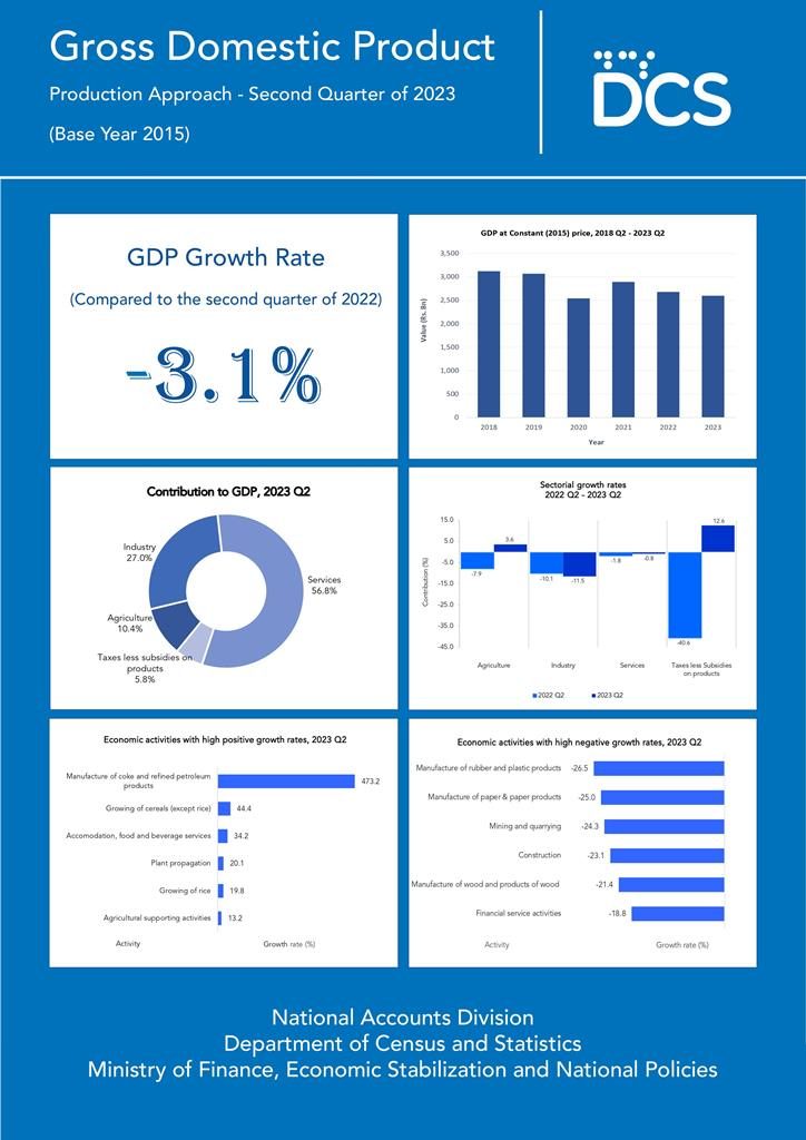 Issuing a communiqué, on releasing National Accounts Estimates, the DCS states that the year on year GDP growth rate for the second quarter of 2023 has been estimated as 3.1 percent of negative growth rate, against the value reported in the same quarter in the year 2022.