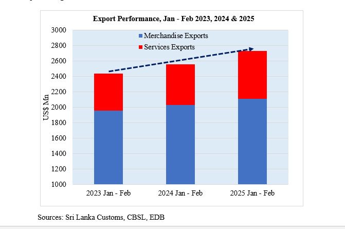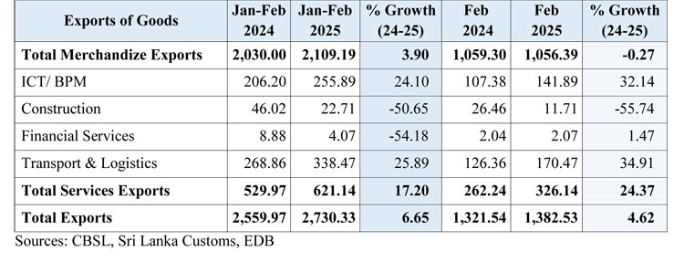 Merchandise exports during the first two months of 2025 are estimated to have increased by 3.9%, reaching US$ 2,109.19 Mn, based on data from Sri Lanka Customs and estimated figures for Gems & Jewellery and Petroleum Products.