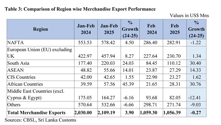 Table 3 shows the comparison of region wise exports during the month of February 2025 and the period of January to February 2025 compared to 2024.