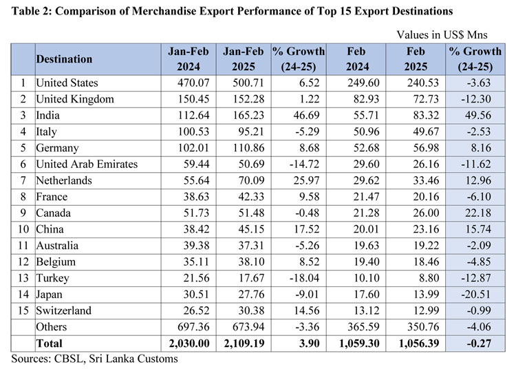 Among the top 15 export markets of Sri Lanka, India, Germany, Netherlands and China have shown positive growth in both February 2025 and the cumulative period of January to February 2025 compared to the corresponding periods in 2024.