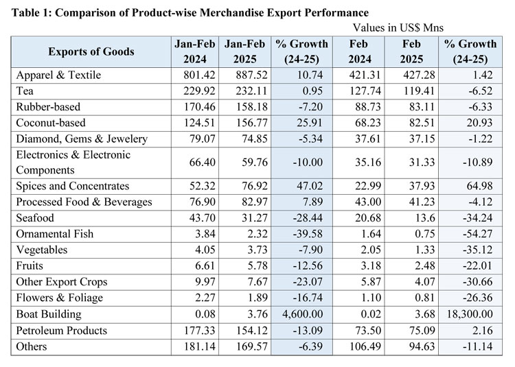 Earnings from export of Apparel, Tea, Coconut products, Spices & Concentrates and Food & Beverages increased by 10.74 %, 0.95 %, 25.91 %, 47.02 % and 7.89% respectively during the period of January – February 2025 in comparison to the corresponding period of 2024.