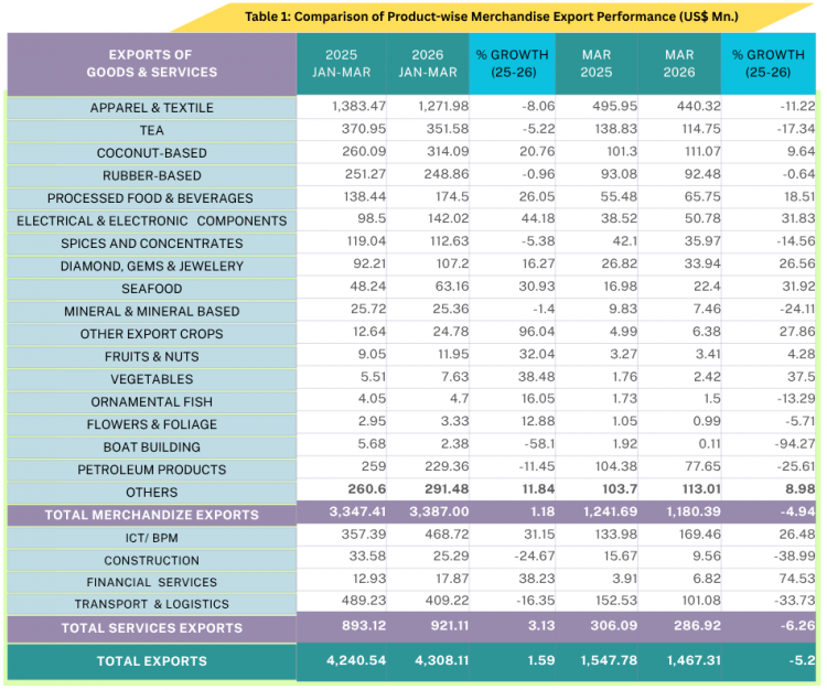 “While Sri Lanka’s export earnings experienced a temporary moderation in March 2026, reaching US$ 1,467.31 million, the overall performance for the first quarter reflects continued resilience and stability in the export sector.