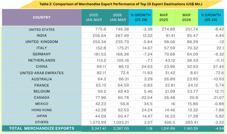 Table 2 shows a comparative analysis of merchandise export performance across the top 15 export markets for March 2025–2026, along with the cumulative figures for the January– March period.