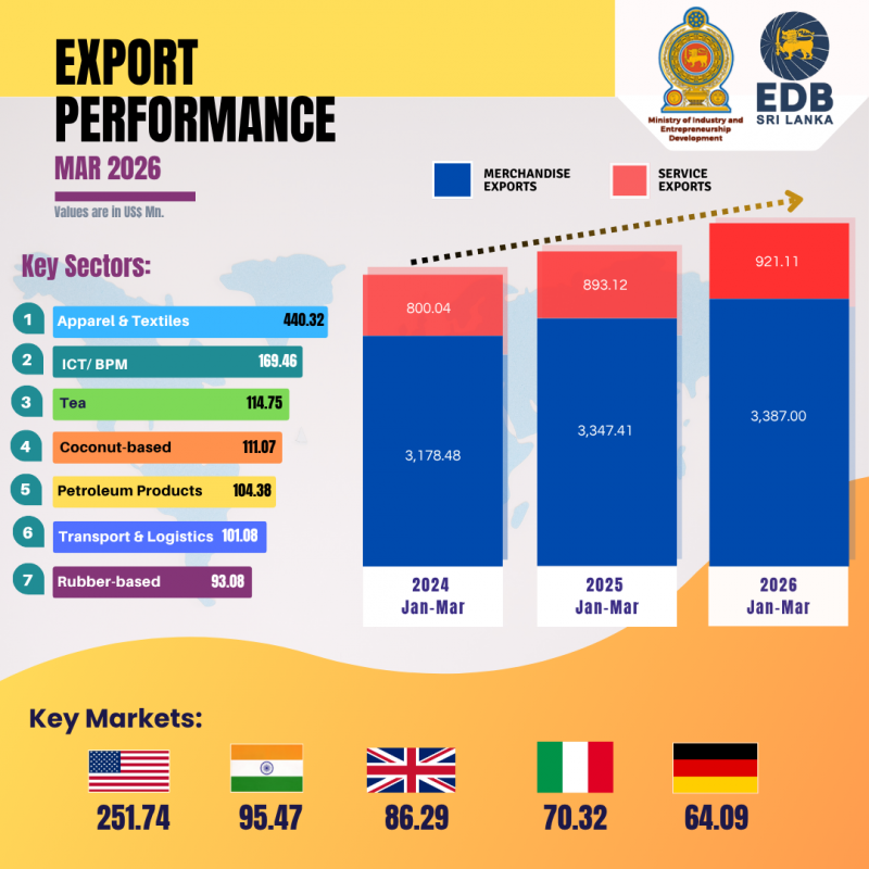 Earnings from services exports were estimated at US$ 286.92 million in March 2026. While this represents a moderate decline of 6.26% compared to March 2025, the services sector continues to demonstrate its growing importance to Sri Lanka’s export portfolio.