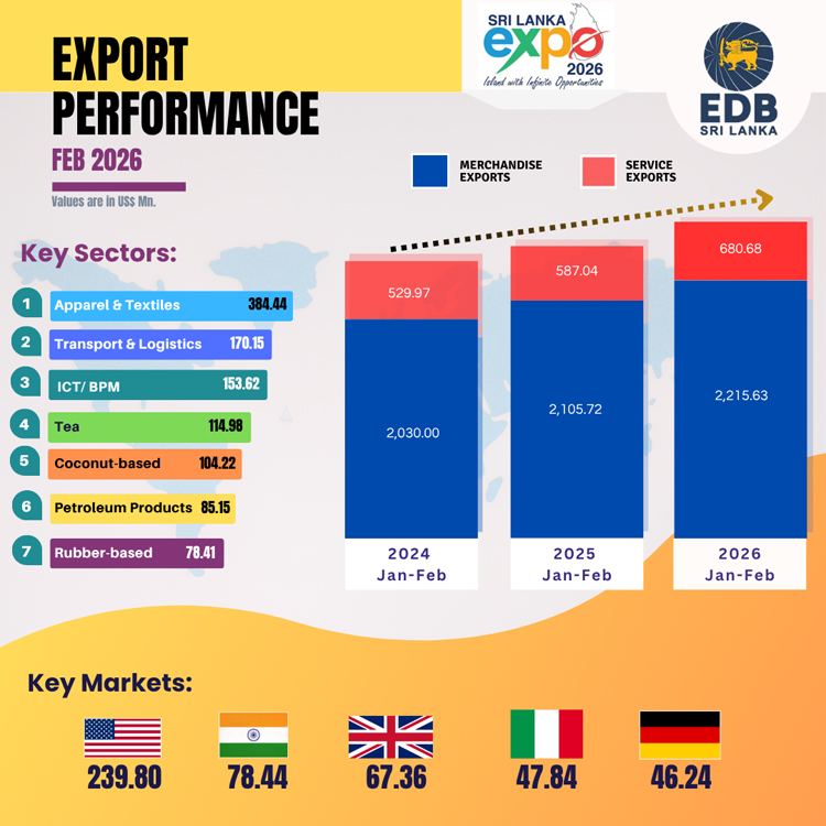 Sri Lanka’s total exports, including both merchandise and services, reached US$ 1,401.78 million in February 2026, reflecting a notable year-on-year growth of 4.22% compared to February 2025.