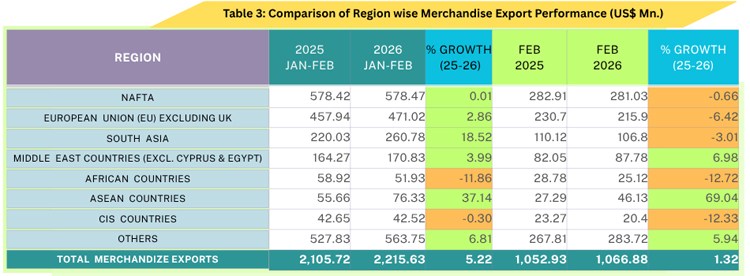 On a cumulative basis, total exports for the period January to February 2026 are estimated at US$ 2,896.31 million, recording a notable growth of 7.56% compared to the same period in 2025.