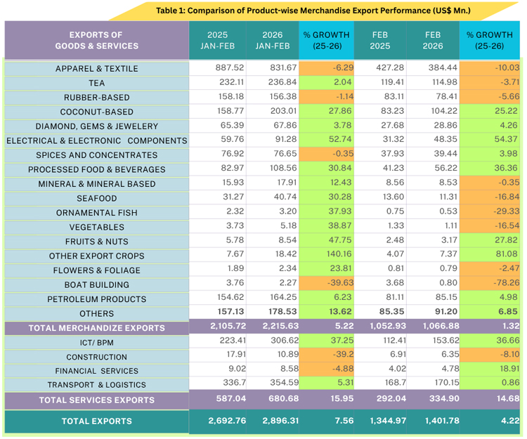 According to provisional data from Sri Lanka Customs, along with estimated figures for Gems & Jewellery and Petroleum Products, merchandise exports for February 2026 increased by 1.32% to US$ 1,066.88 million.