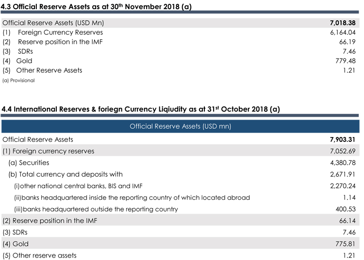 Sri Lanka's foreign exchange reserves had tumbled by over US $ 884.9 million in November 2018, to US $ 7,018.38 million latest official data shows.