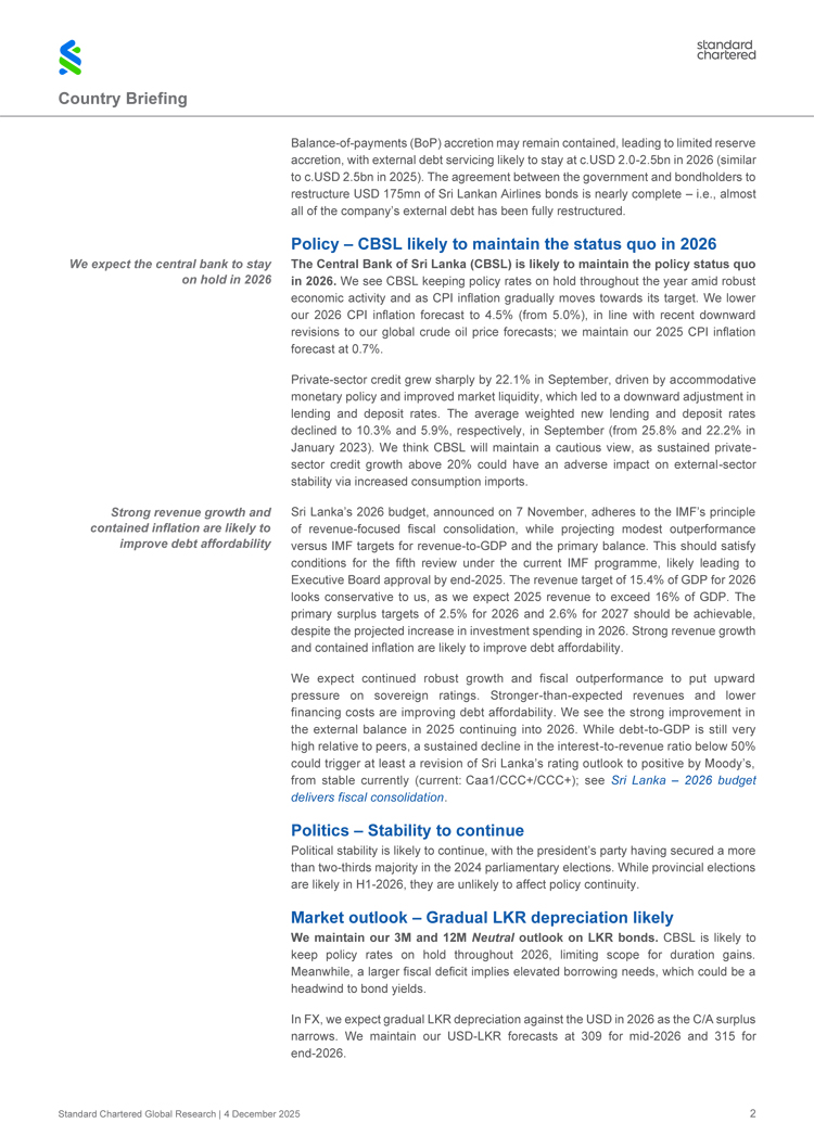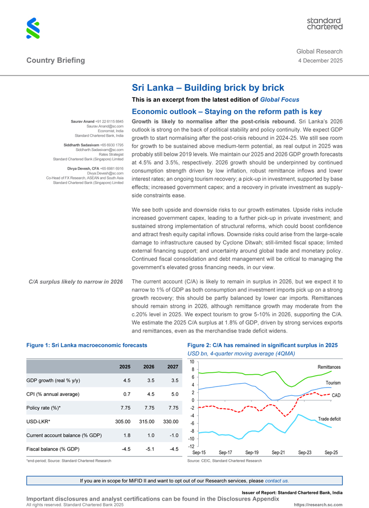 Standard Chartered expects the Central Bank of Sri Lanka to keep policy rates unchanged throughout 2026, with inflation forecast at 4.5%. The report also anticipates gradual depreciation of the rupee, with the USD/LKR rate seen at 315 by end-2026.