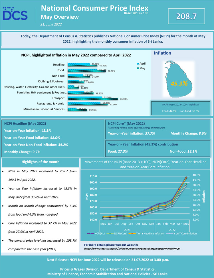 The Department of Census and Statistics (DCS) on Tuesday released the National Consumer Price Index (NCPI) and the inflation rate for the month of May 2022.
