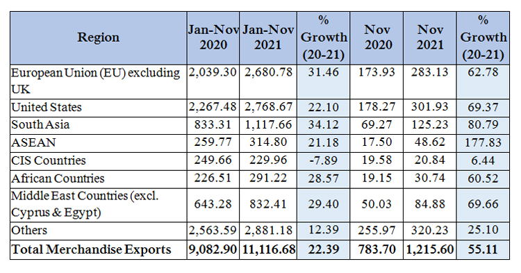 On a region wise comparison exports to all other regions increased except CIS regions during the period of January to November 2021 compared with the corresponding period of the previous year.