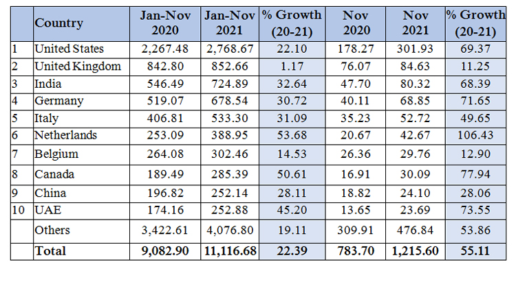 Exports to United Kingdom as the second largest trading partner recorded an increase of 1.17 % to US$ 852.66 Mn during the period of January to November 2021 compared with the corresponding period of previous year. This performance has resulted in the increased Exports recorded in Apparel & Textile, Rubber based Products sectors (Pneumatic & Retreated Rubber Tyres & Tubes, Industrial & Surgical Gloves of Rubber) and Other Electrical & Electronic Products.