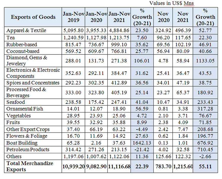 For the period of January to November 2021, merchandise exports increased by 22.39 % to US$ 11,116.68 Million compared to the corresponding period of 2020, following increased exports of almost all the major product sectors; Apparel & Textiles, Tea, Rubber-based products, Coconut based products, Electronics & Electronic Components, Spices and Concentrates, Food & Beverages, Seafood and Ornamental fish as shown in the table below.