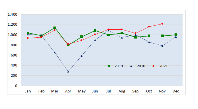 Monthly Merchandize Export Performance 2019, 2020 & January-November 2021 in Millions of US$