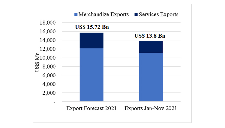 The revised export target of the Export Development Board for 2021 is US$ 15.72 billion and of that we expect US$ 12.14 billion from merchandise exports and US$ 3.58 billion from services exports. During the period January to November 2021, earnings from exports recorded US$ 13.8 billion including the estimated services data for July to November and 88 % achieved from the revised export target.
