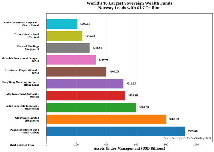 Norway's Government Pension Fund Global, established in 1990, now commands $1.74 trillion in assets—larger than the economies of most nations. In 2023 alone, it generated $222 billion in returns, creating fiscal space equivalent to three times Sri Lanka's entire GDP. China's twin funds—China Investment Corporation ($1.35 trillion) and SAFE Investment Company ($1.09 trillion)—have transformed foreign exchange reserves into global investment power, acquiring strategic assets from London real estate to African infrastructure.