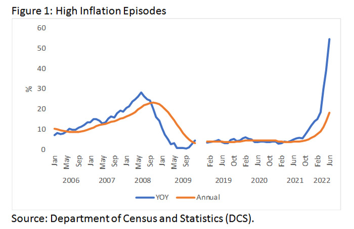 The bad news on inflation keeps coming. As of June 2022, year-on-year (YOY) inflation nationally is estimated at an all-time high of 59%. Annual inflation is lagging significantly behind at around 21%, indicative of the speed at which price inflation has been spiralling in recent months. This is in sharp contrast to Sri Lanka’s previous bout of high inflation in 2008 where the YOY increase was far more gradual (Figure 1). Then too, a similar combination of factors was at play. On the external front, a global financial crisis, a spike in international oil prices and sky-rocketing food prices prevailed. On the domestic front, a depressingly familiar combination of unsustainable fiscal, monetary and exchange rate policies were in place.
