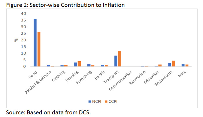 A sector-wise breakdown of the National Consumer Price Index (NCPI) and the Colombo Consumer Price Index (CCPI) of YOY inflation in June 2022 shows that demand-driven domestic inflationary pressures appear to be responsible for much less of the rise in headline inflation. Food price increases are contributing the largest share of 36% towards the YOY national increase in inflation in the NCPI (carrying a weight of 44%) while it contributes a similarly large share of 26% in the CCPI (with a weight of 28%). Transport is the second largest contributor (8-11%) in both indices. Overall, the strength of inflation appears to mainly reflect the large increases in energy and food prices; in fact, when inflation is driven largely by excess liquidity and demand, price increases across goods and services tend to be more uniform.