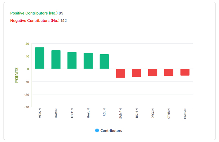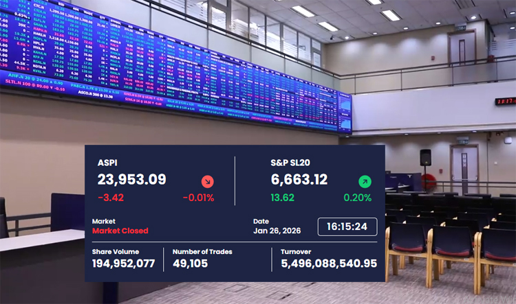 At the end of trading, the ASPI closed at 23,953.09 points, while the S&P SL20 Index settled at 6,663.12 points.