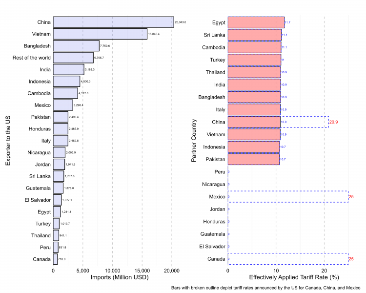 Figure 2: The US imports of wearing apparel (2024) and effectively applied tariffs for each exporter (2023)