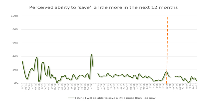 To assess the ability to manage the cost of living and to have something left over, we asked the respondents about their personal savings in the coming 12 months. The perception of the public’s ability to save a ‘little more’ than what they do at present fell in January 2021 to an almost 9-year low of just 1 percent but picked up to 10 by March reflecting the optimism seen earlier. However, that momentum was not sustained. In April it stood at 6 percent, rose marginally to 8 percent and fell to 4 percent by June 2021. All indications above leads to a disappointing situation of hopelessness about the near term of the economy.