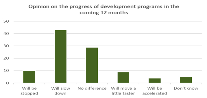 The below chart is based on a particular question in the survey as to the perception on the pace of development activity in the coming twelve months. It is noticeably clear that people are not of the opinion much will happen. More than half believe development work will slow down or completely stop. This view is certainly linked to the low expectations of their individual opportunities. We shall in the next quarter undertake a further analysis to understand how strong this correlation has been in the past and if there have been any significant departures in given instances.