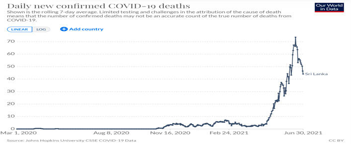 As shown in the above graph by Oxford University, confirmed daily deaths in Sri Lanka began to rise in April and May and even with a slight reduction in June the numbers were far higher than the previous quarter. This led to the fall in the optimism that was beginning to build. This change seems to be well correlated to the lapses in management of the pandemic and the rising daily reported death rates with a lag of few weeks.