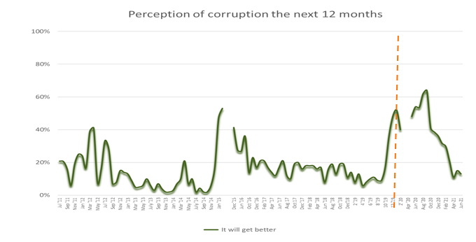 The positive sentiments among the people that corruption will become less fell from 21 percent at end March 2021 to 13 percent by end June. That is a drastic decline from the 64 percent recorded September 2020 with the installation of the new government; the highest since we started measuring it ten years ago. This fall in confidence on corruption at such a rapid pace is a serious concern.