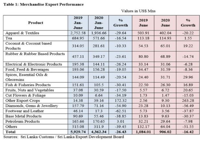 Total export earning for January to June 2020 was US$ 4,362.34 Mn compared to US $ 5,929.74 Mn recorded in a similar period of the previous year – a decline of 26.43%. This is a 58% achievement of Revised Merchandise Export Target of US$ 7,521 Mn in 2020.