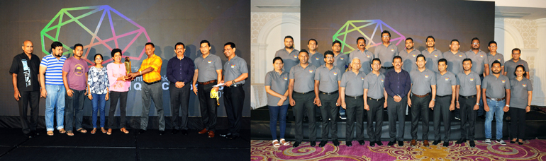 (On left) The Winners – the People’s Bank ‘C’ Team. Mr. Susil Peiris, the Director/Group CIO of Metropolitan Office (Pvt) Ltd (Platinum Sponsor) hands over the champion’s trophy to the Captain of the People’s Bank ‘C’ Team. The Chief Guest Mr. D Kumarathunga, the Director of Payment & Settlement at CBSL, the President of the Clearing Association of Bankers, Mr. M. Razak Deen of MCB Bank and the Immediate Past President of the Clearing Association of Bankers, Mr. Upul De Silva of People’s Bank are also present and (on right) The 1st Runners Up – the Seylan Bank Team receive their trophy from Mr. Thurab Hilmy, the General Manager of the Transnational Group (Gold Sponsor). The Chief Guest, Mr. D. Kumarathunga, the Director of Payment & Settlement at CBSL and the President of the Clearing Association of Bankers, Mr. M. Razak Deen of MCB Bank also present