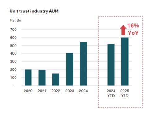 The unit trust industry of Sri Lanka reported a 16.0% year-over-year growth of its assets under management (AUM) to Rs. 603 Bn by the end of October 2025. This is also up from Rs. 592 Bn in September. These assets are currently managed across 85 funds by 16 management companies.