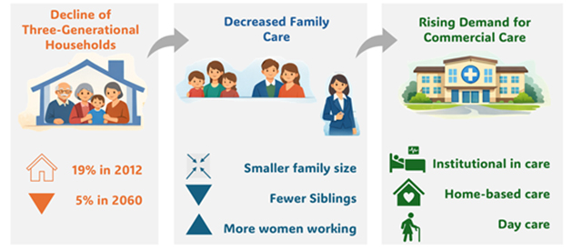 Moreover, there is a growing care deficit – a gap in demand and availability of caregivers, for the ageing population. Around 76% of 65+ years population live with children, which is projected to decline over time with the emerging cultural and social shift from home-based care towards institutional care. Three-generation households are projected to decline from 19% in 2012 to 5% by 2060. The decreased availability of family care due to smaller family sizes and growing female employment will increase demand for commercial care. Yet, as discussed, most elderly people will not have the financial capacity to seek commercial care. At the same time, the elder care sector in Sri Lanka is polarised. On the one hand, there is an excess demand for the limited number of state-run elder care institutions—often of relatively low quality, while fee-based facilities remain unaffordable for the average elderly. Hence, the less-affluent middle-class elderly have virtually no options for institutional care. On the other hand, formal and professional home-based care is costly, while lower-cost options are informal and ad hoc. Moreover, free adult day care centres are limited and often target low-income elders, with almost no paid day-care options for other income groups. Across all care options, there is an acute deficit in both formal and informal care workers. Projections indicate a 149,076 deficit of long-term care workers by 2037.