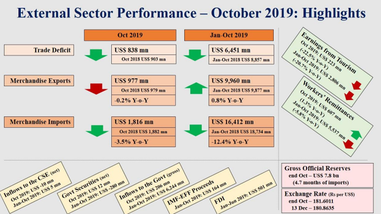 According to the latest external trade data released by the Central Bank, country’s trade deficit had contracted in October 2019 (year-on-year), with the decline in expenditure on imports and a marginal decline in earnings from exports.