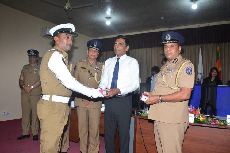 Hon. Ananda Wijepala, Minister of Public Security and Parliamentary Affairs ceremoniously handing over mobile phones to traffic police officers in the Nothern province.