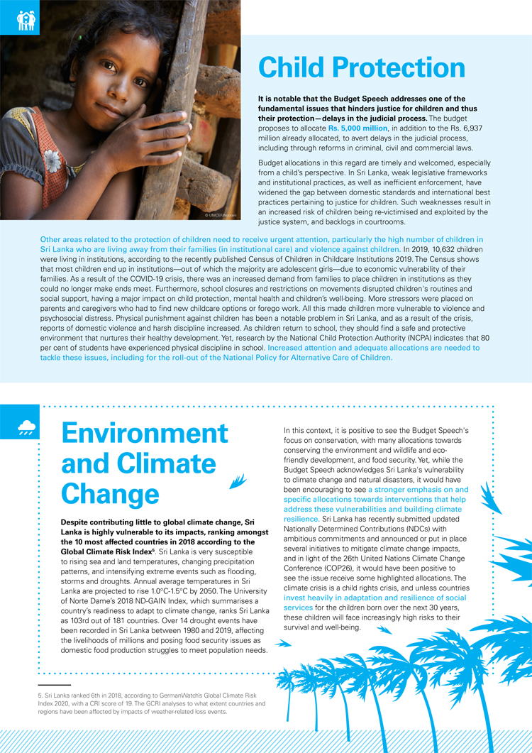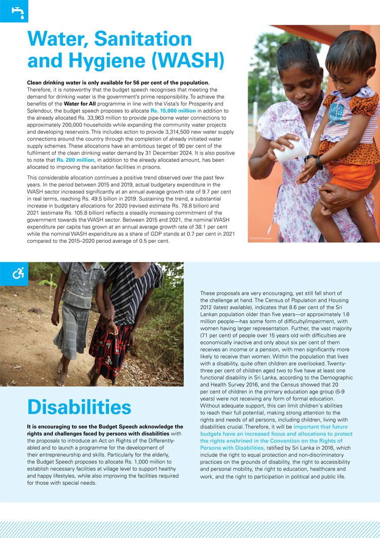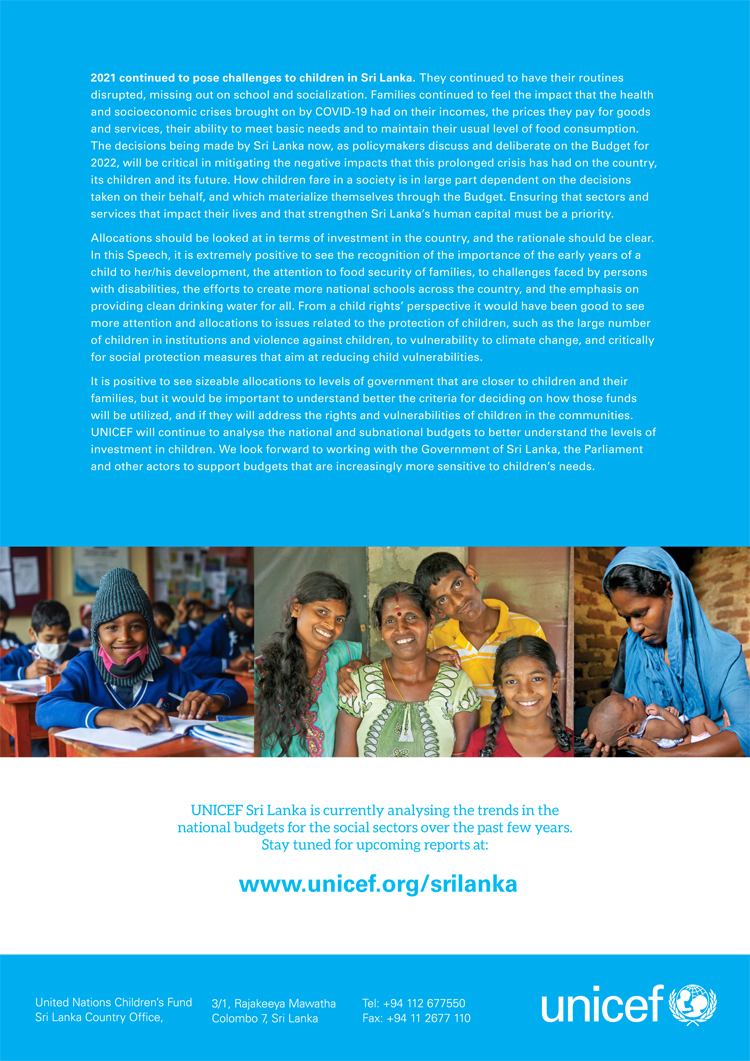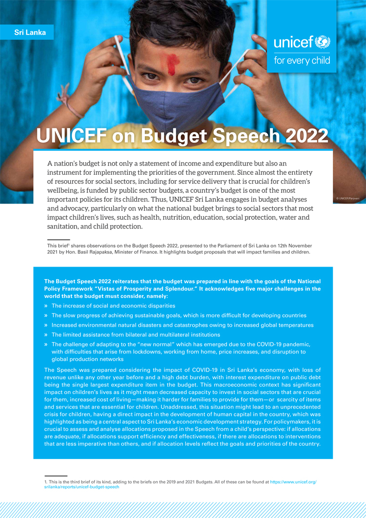 A nation’s budget is not only a statement of income and expenditure but also an instrument for implementing the priorities of the government. Since almost the entirety of resources for social sectors, including for service delivery that is crucial for children’s wellbeing, is funded by public sector budgets, a country’s budget is one of the most important policies for its children. Thus, UNICEF Sri Lanka engages in budget analyses and advocacy, particularly on what the national budget brings to social sectors that most impact children’s lives, such as health, nutrition, education, social protection, water and sanitation, and child protection.