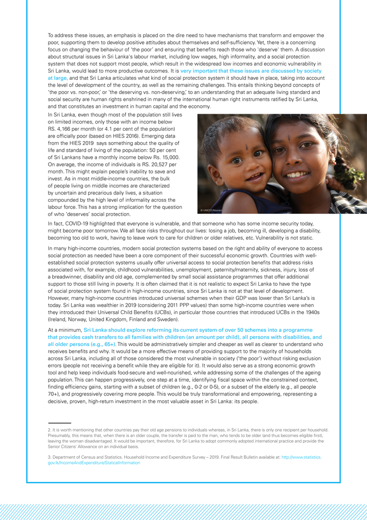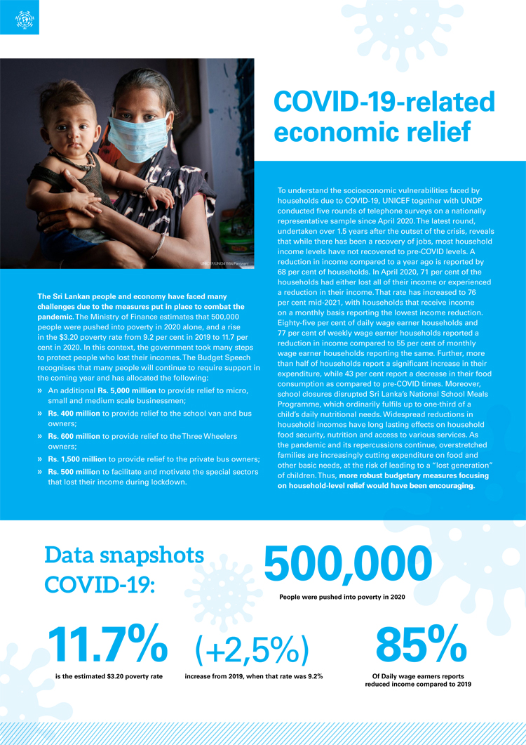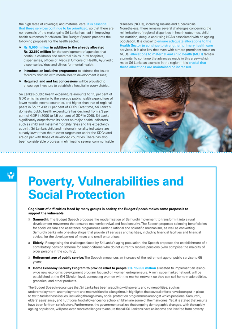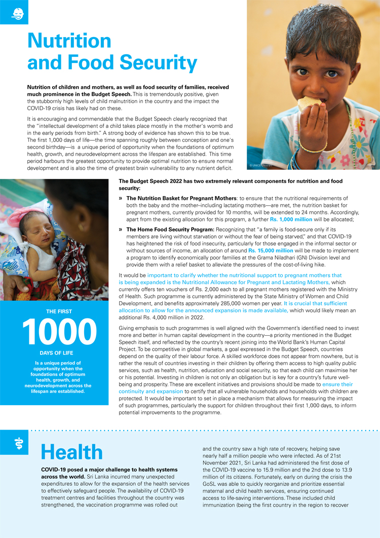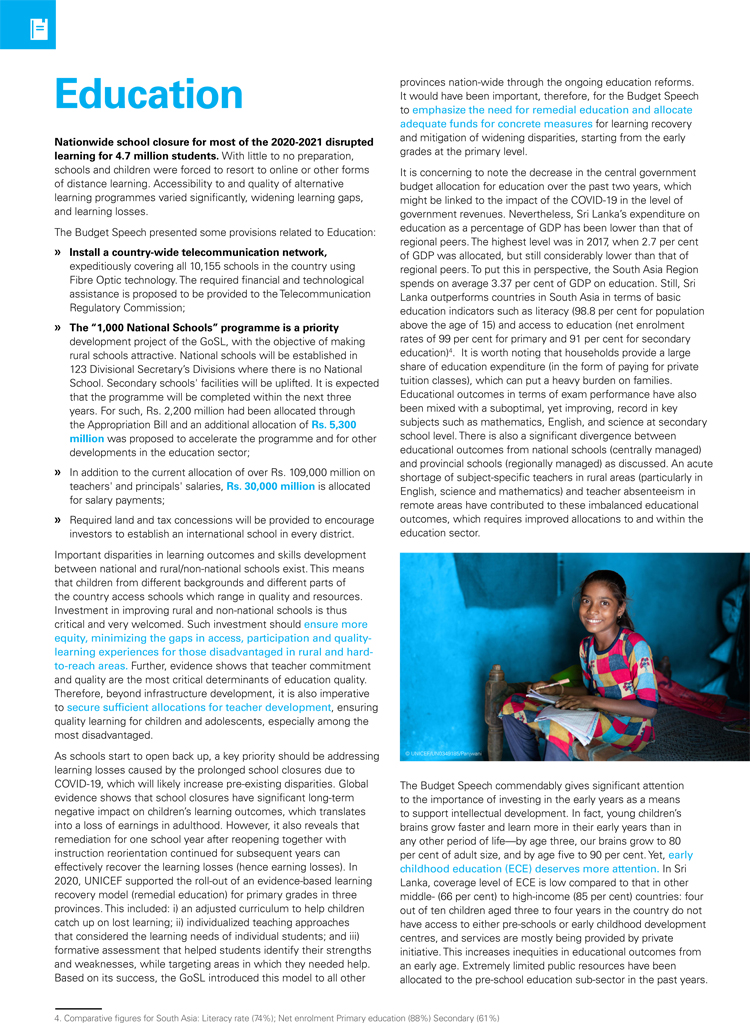 A nation’s budget is not only a statement of income and expenditure but also an instrument for implementing the priorities of the government. Since almost the entirety of resources for social sectors, including for service delivery that is crucial for children’s wellbeing, is funded by public sector budgets, a country’s budget is one of the most important policies for its children. Thus, UNICEF Sri Lanka engages in budget analyses and advocacy, particularly on what the national budget brings to social sectors that most impact children’s lives, such as health, nutrition, education, social protection, water and sanitation, and child protection.